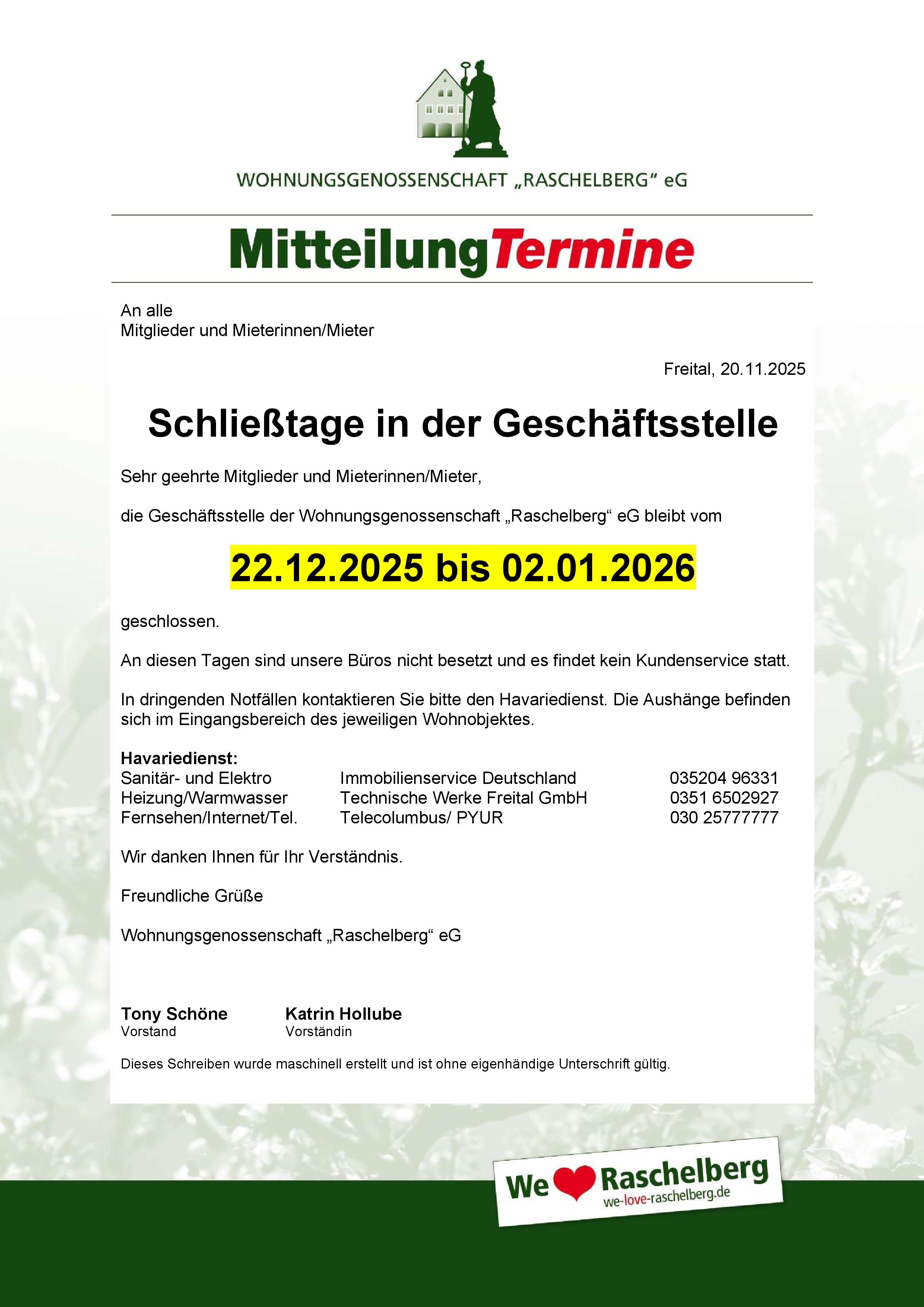 Ihre Ansprechpartner in der Wohnungsgenossenschaft „Raschelberg“ eG