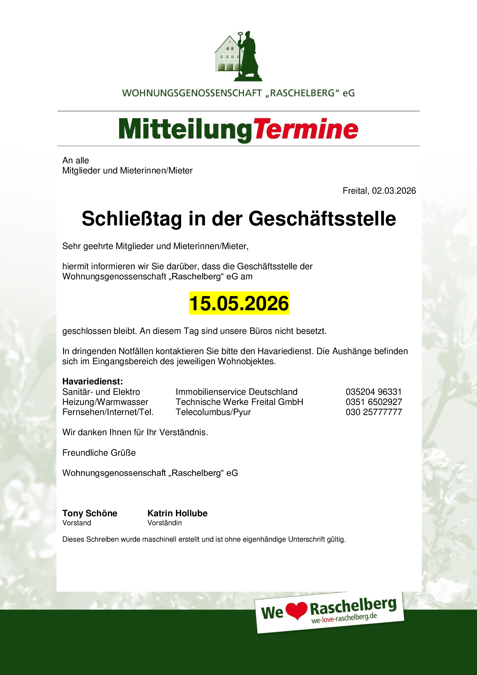 Bei Anliegen zu Ihrem Mietverhältnis oder bei Reparaturanfragen, wenden Sie sich bitte an die Kolleginnen/Kollegen von Mieter-/Mitgliederservice und Reparatur/Instandhaltung.